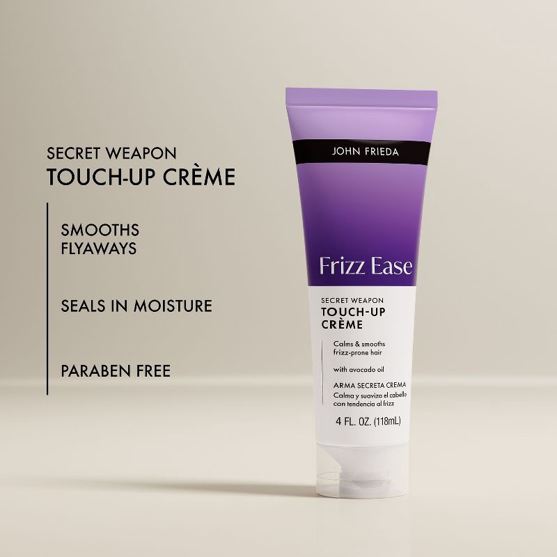 - SECRET WEAPON FOR FRIZZ: John Frieda Touch-Up Crème with avocado oil transforms parched, unruly hair into smooth, ultra-glossy locks you can see and feel