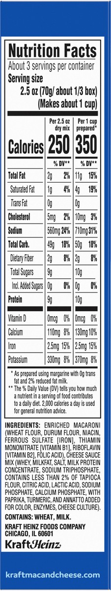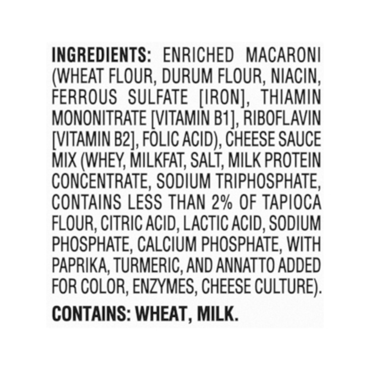 Enriched Macaroni (Wheat Flour, Durum Flour, Niacin, Ferrous Sulfate [Iron], Thiamin Mononitrate [Vitamin B1], Riboflavin [Vitamin B2], Folic Acid), Cheese Sauce Mix (Whey, Milkfat, Salt, Milk Protein…