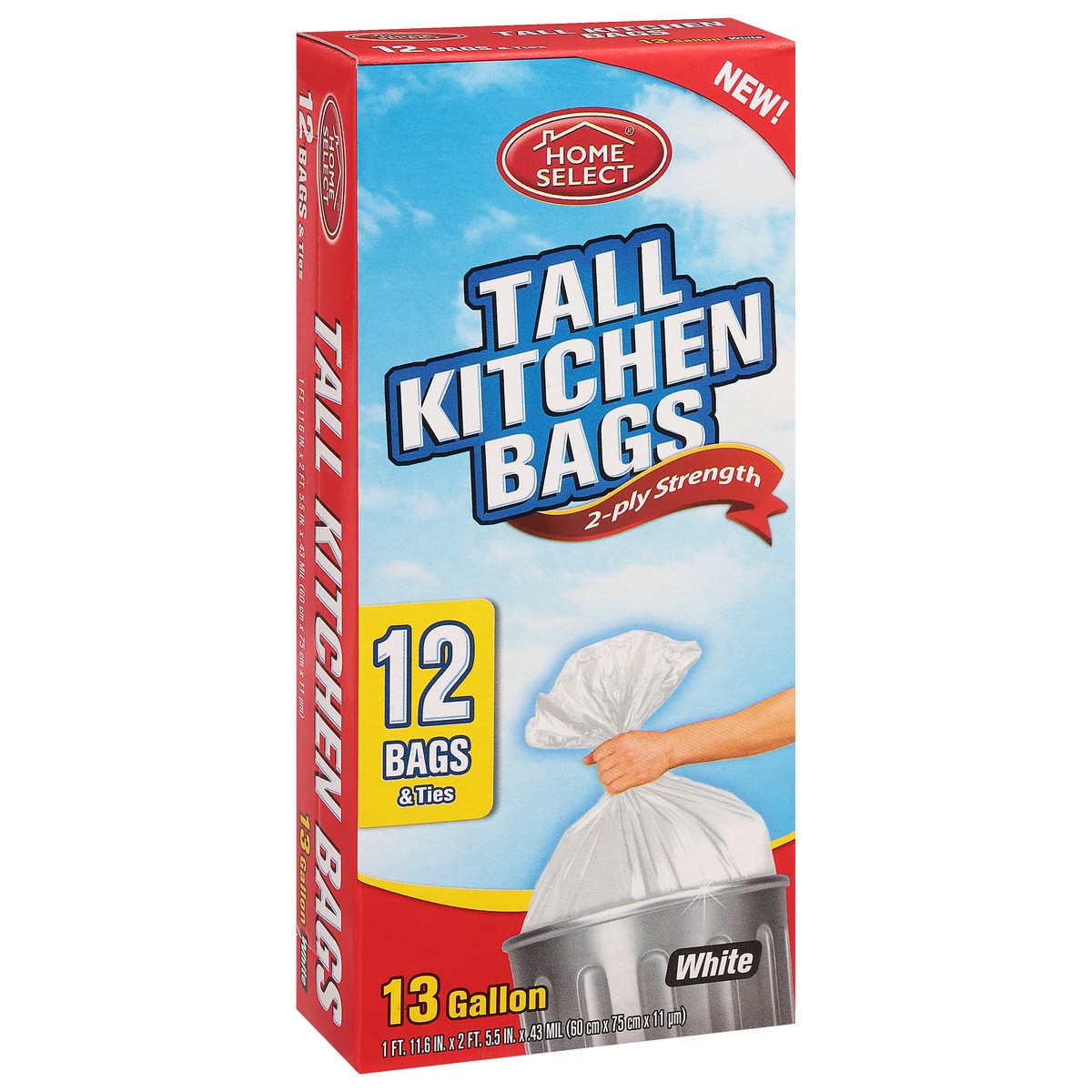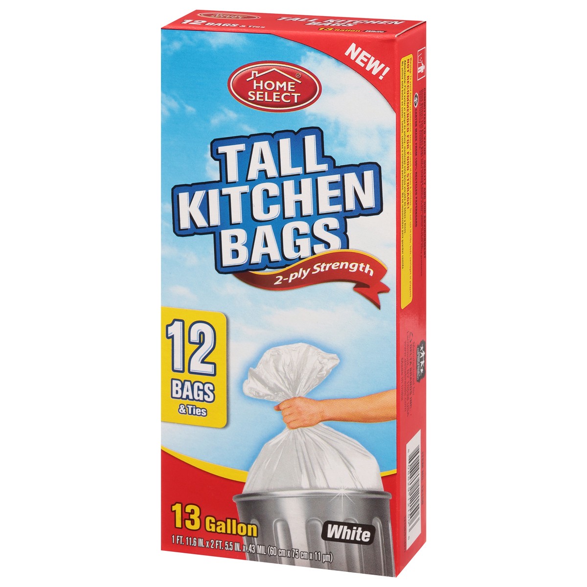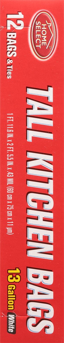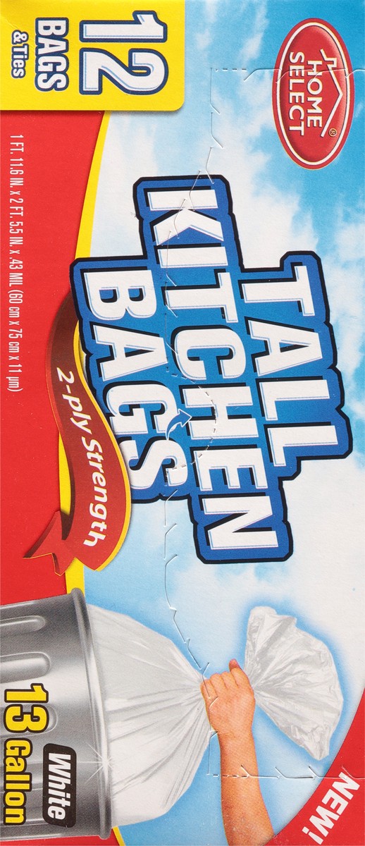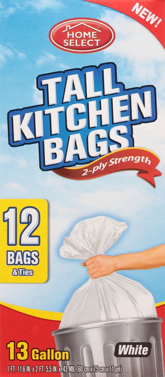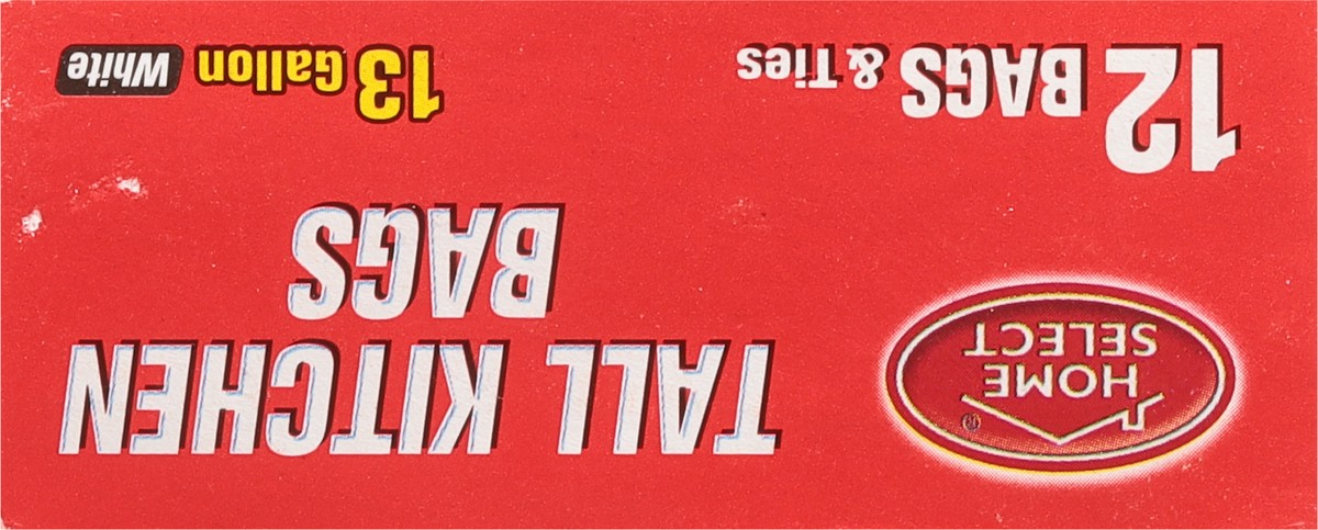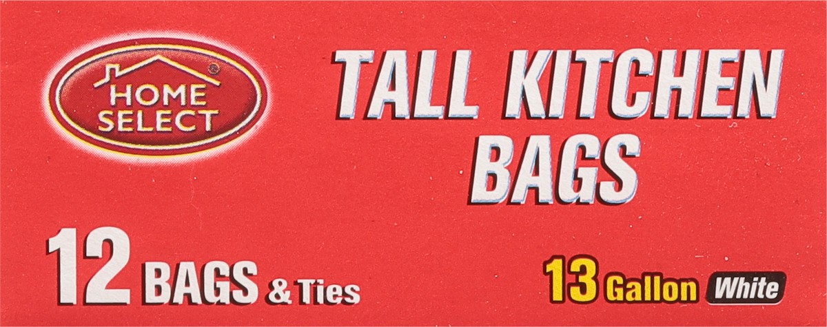 New! 12 Bags & ties. 13 gallon. Home Select Tall Kitchen Bags offer strong bottom seals, which means extra protection against leaking or breaking. Prime value for your family! Committed to value, qual…