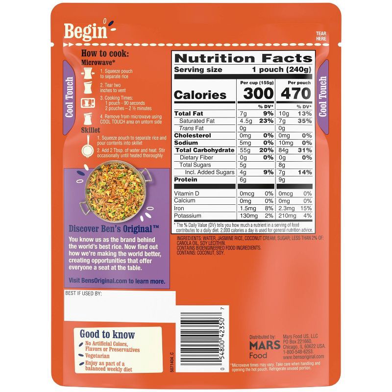 - One pouch of BEN'S ORIGINAL Ready Rice Coconut Jasmine Flavored Rice