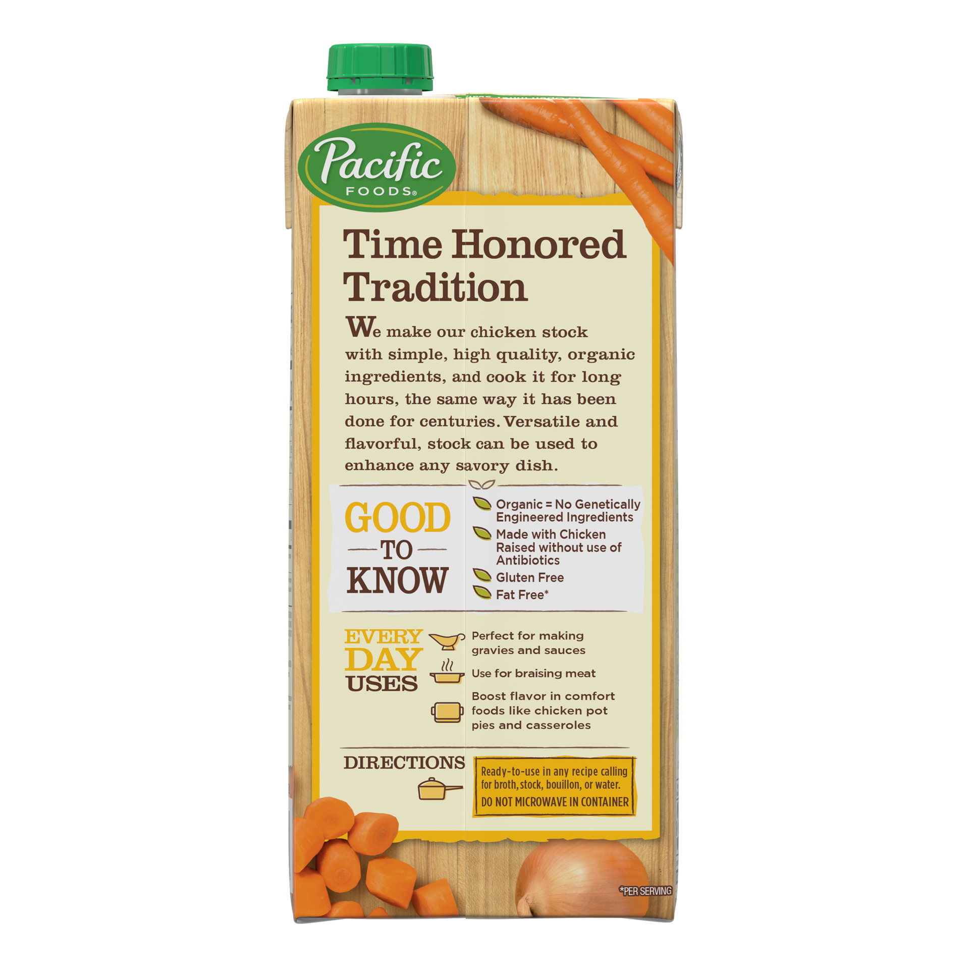 - USDA-certified organic chicken stock made from non-GMO ingredients and free of gluten, soy, wheat and yeast
