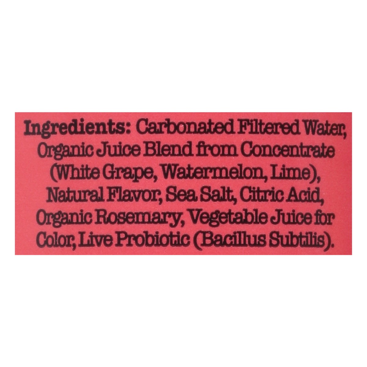 Carbonated Filtered Water, Organic Juice Blend from Concentrate (White Grape, Watermelon, Lime), Natural Flavor, Sea Salt, Citric Acid, Organic Rosemary, Vegetable Juice for Color, Live Probiotic (Bac…
