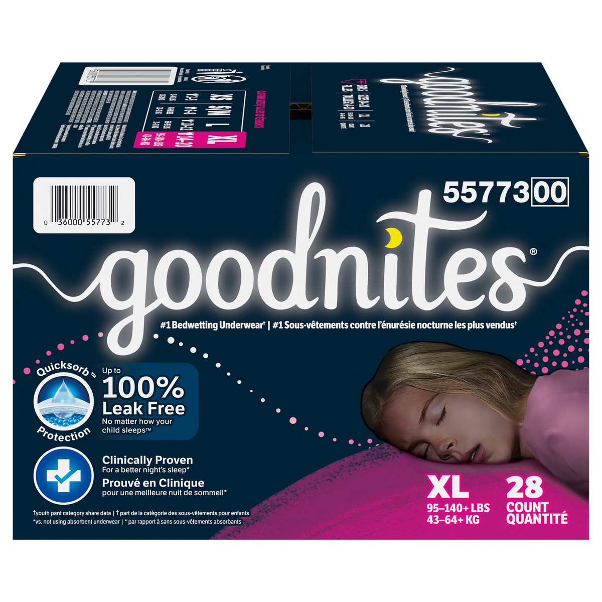 - Wake Up Dry: Goodnites bedwetting underwear for girls features Quicksorb Protection for up to 100% leak free nights no matter how your child sleeps