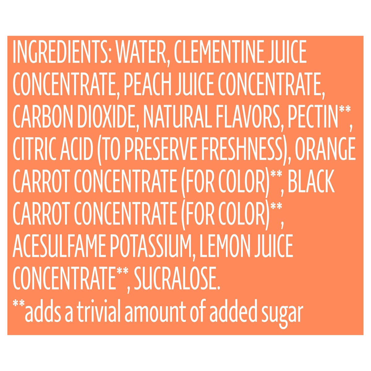 INGREDIENTS: WATER, CLEMENTINE JUICE CONCENTRATE, PEACH JUICE CONCENTRATE, CARBON DIOXIDE, NATURAL FLAVORS, PECTIN**, CITRIC ACID (TO PRESERVE FRESHNESS), ORANGE CARROT CONCENTRATE (FOR COLOR)**, BLAC…