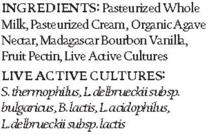 Cultured Pasteurized Whole Milk, Cane Sugar, Madagascar Bourbon Vanilla (Vanilla Extract, Vanilla Bean Specks), Fruit PectinLive Active Cultures: S. thermophilus, L. bulgaricus, Bifidobacterium, L. ac…