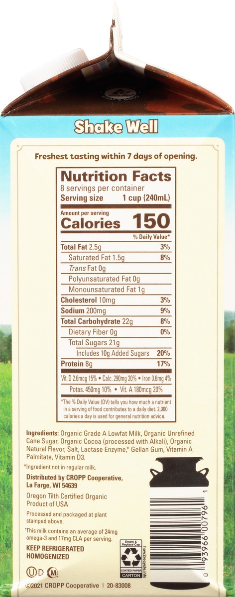 Organic Grade A Low Fat Milk, Organic Cane Sugar, Organic Cocoa (Processed with Alkali), Organic Natural Flavor, Salt, Lactase Enzyme, Gellan Gum, Vitamin A Palmitate, Vitamin D3.