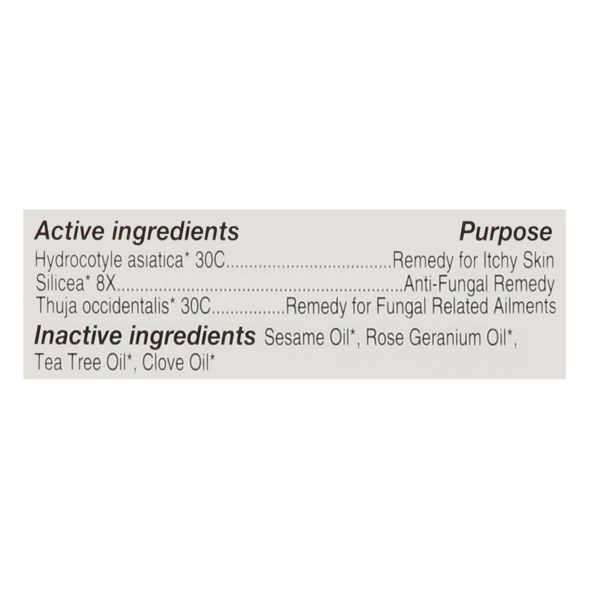 Active Ingredients: *Hydrocotyle Asiatica 30C, Remedy for Itchy Skin; *Silicea 8X, Anti-Fungal Remedy; *Thuja Occidentalis 30C, Remedy for Fungal Related Ailments. Inactive Ingredients: Sesame Oil (US…