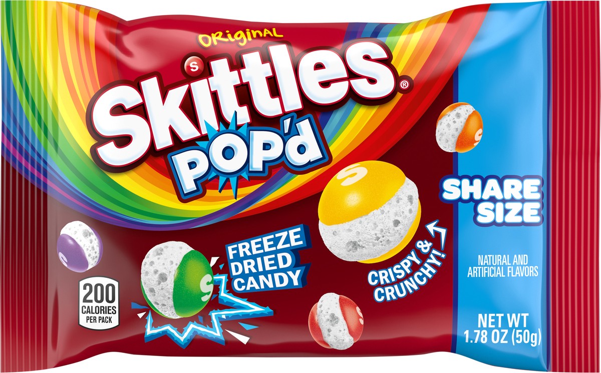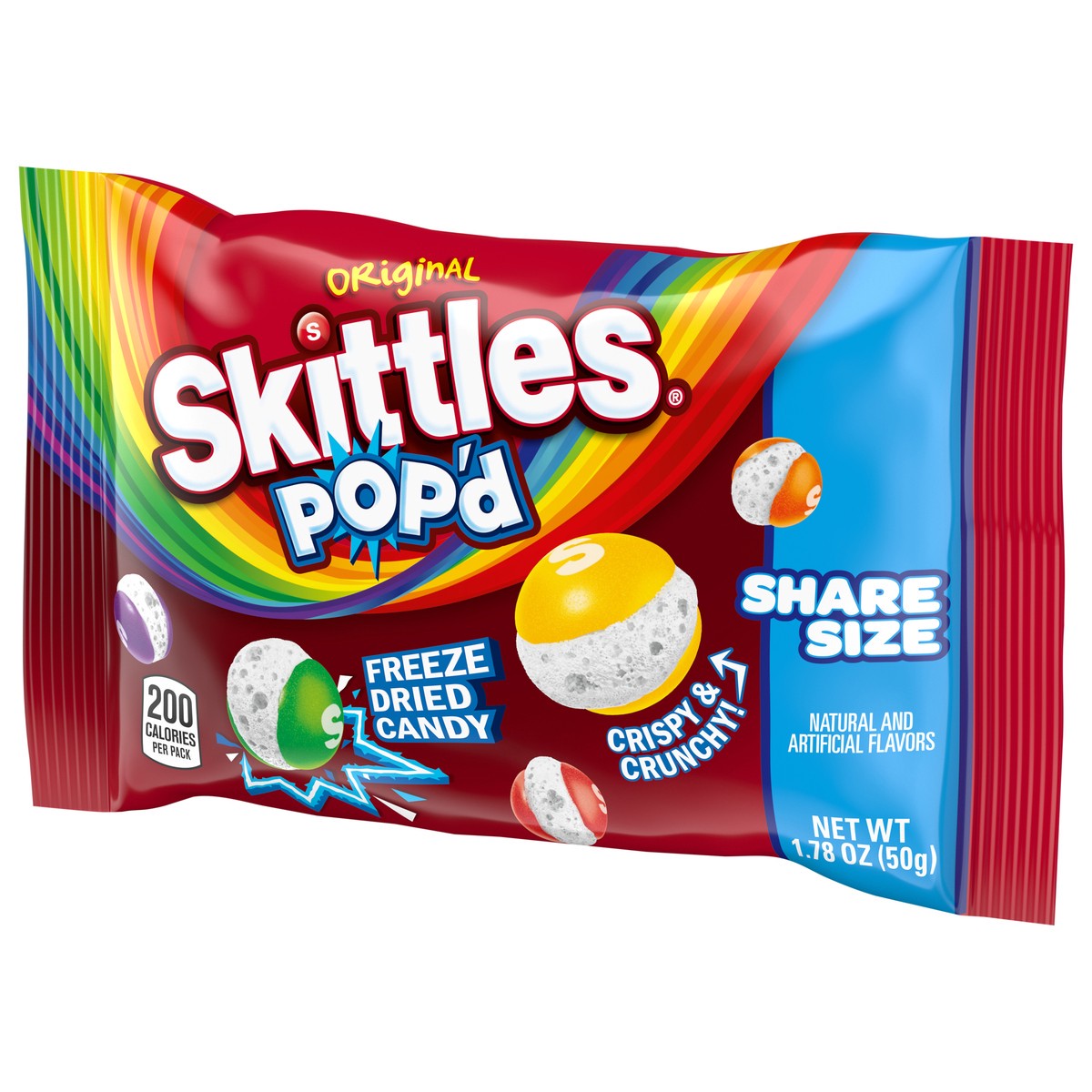 - Contains one (1) 1.78-ounce share size bag of SKITTLES POP''d Originals Freeze Dried CandyAn unexpected CRUNCHY and CRISPY way to enjoy SKITTLES Fruity Flavors of strawberry, lemon, lime, grape, and orangeFor snacking on a road trip, keep a share size bag of SKITTLES POP''d handy for a burst of fruity flavorMake your next event POP with SKITTLES POP''d candy in candy dishes for party guests to enjoySKITTLES POP''d are the perfect freeze dried snack for movie night that combines chewy, crunchy, and fruity flavors