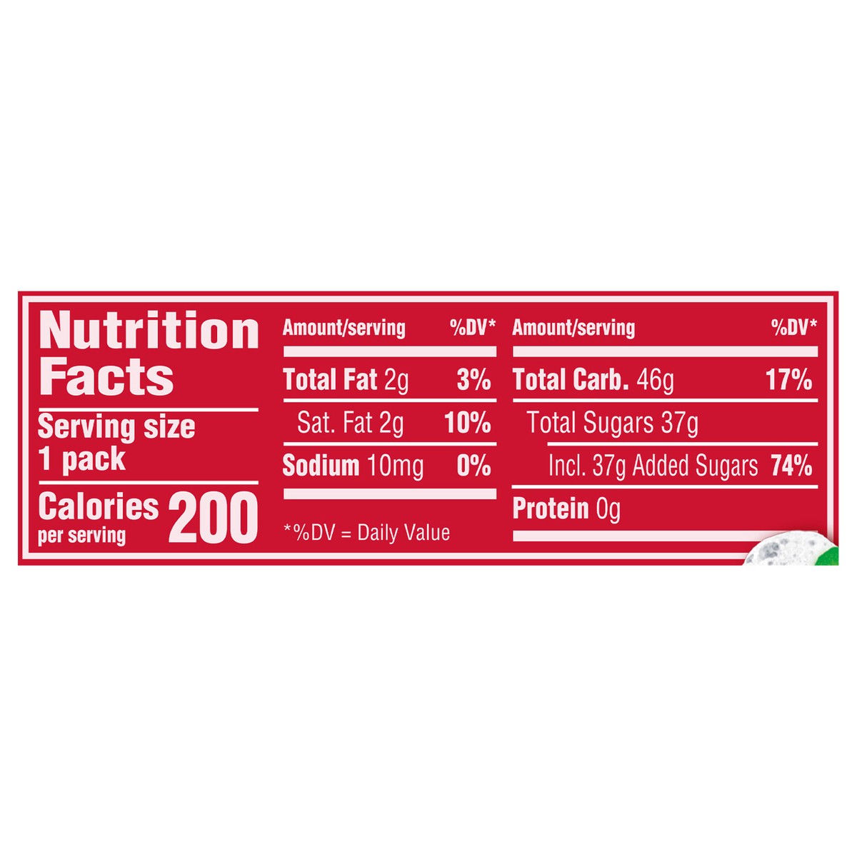 SUGAR, CORN SYRUP, HYDROGENATEDPALM KERNEL OIL; LESS THAN 2% OF: CITRIC ACID,TAPIOCA DEXTRIN, MODIFIED CORNSTARCH, NATURALAND ARTIFICIAL FLAVORS, COLORS (INCLUDES RED 40LAKE, YELLOW 5 LAKE, BLUE 2 LAK…