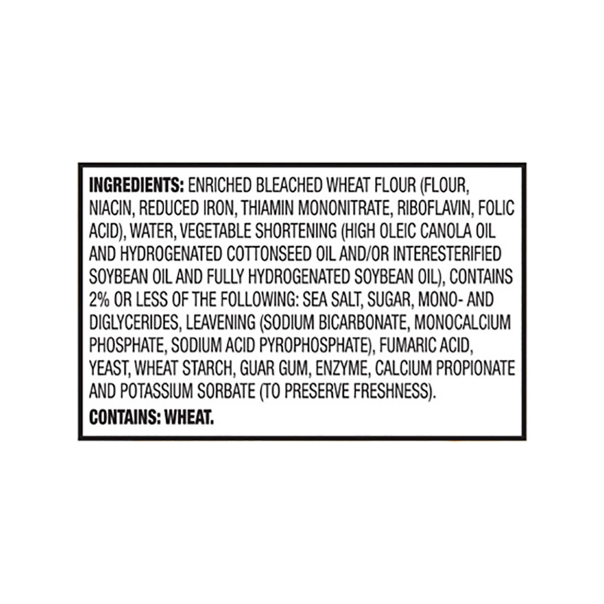 Enriched Bleached Wheat Flour (Flour, Niacin, Reduced Iron, Thiamin Mononitrate, Riboflavin, Folic Acid), Water, Vegetable Shortening (High Oleic Canola Oil and Hydrogenated Cottonseed Oil and/or Inte…