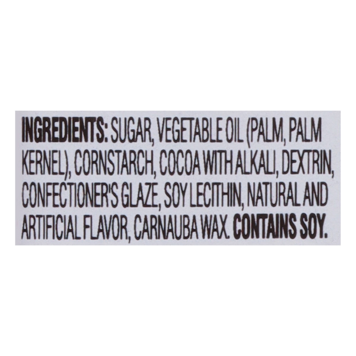 Sugar, Vegetable Oil (Palm, Palm Kernel), Cornstarch, Cocoa with Alkali, Dextrin, Confectioners Glaze, Soy Lecithin, Natural and Artificial Flavor, Carnauba Wax.