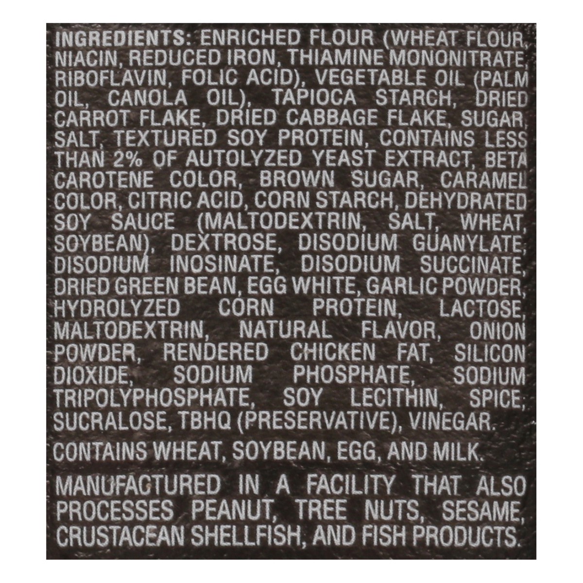Enriched Flour (Wheat Flour, Niacin, Reduced Iron, Thiamine Mononitrate, Riboflavin, Folic Acid), Vegetable Oil (Palm Oil, Canola Oil), Tapioca Starch, Dried Carrot Flake, Dried Cabbage Flake, Sugar, …