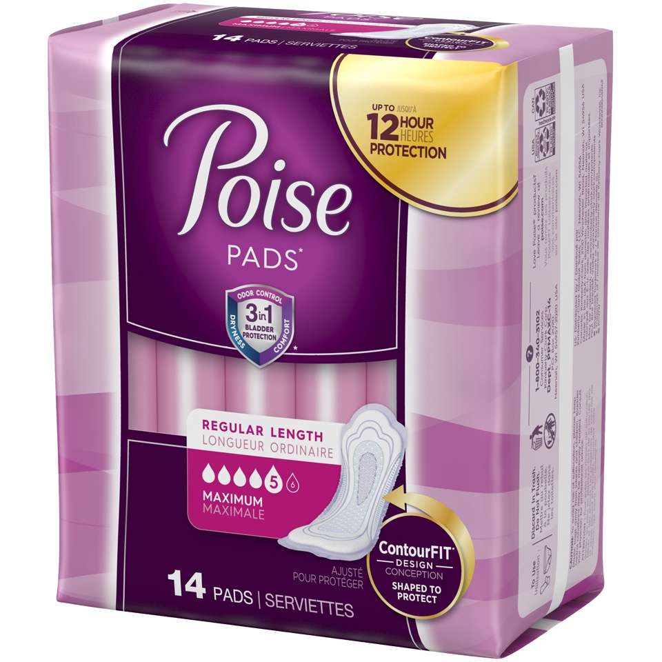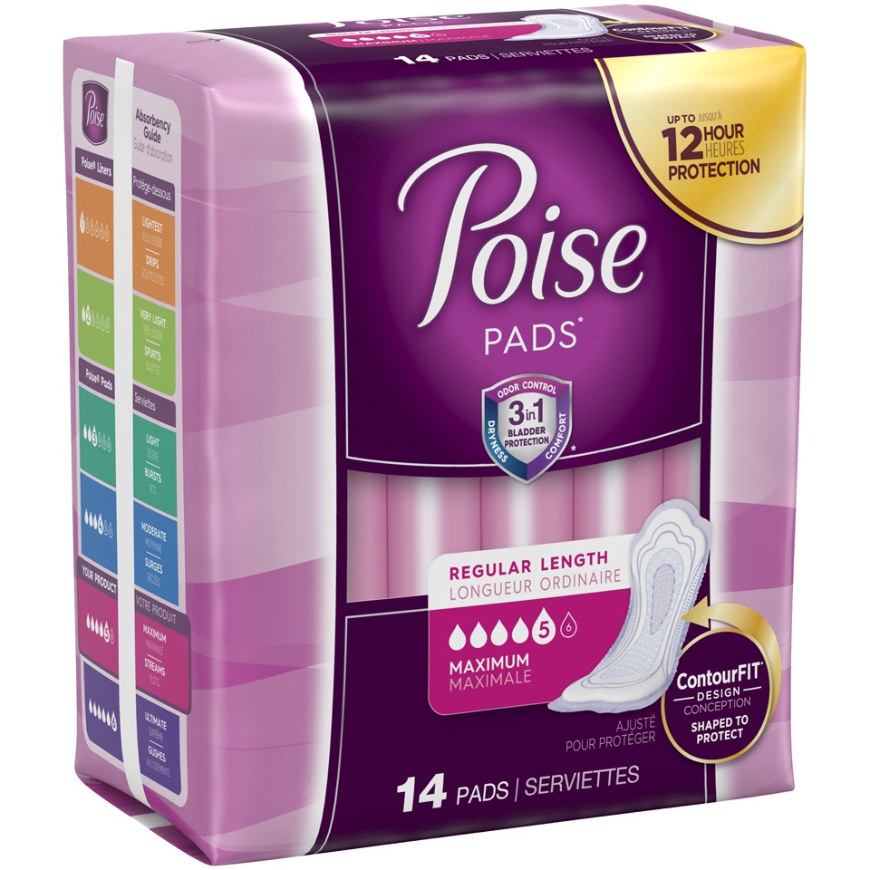 - NEW Maximum Absorbency 5 Drop: Poise Postpartum Incontinence Pads, Maximum Absorbency, Regular Length 14 pads; HSA/FSA-eligible in the U.S. (packaging may vary).