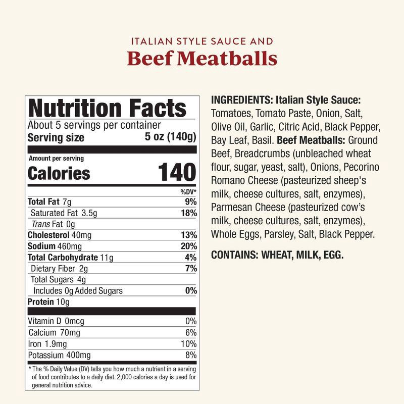 Italian Style Sauce: Tomatoes, Tomato Paste, Onion, Salt, Olive Oil, Garlic, Citric Acid, Black Pepper, Bay Leaf, Basil, Beef Meatballs: Ground Beef, Breadcrumbs (Unbleached Wheat Flour, Sugar, Yeast,…