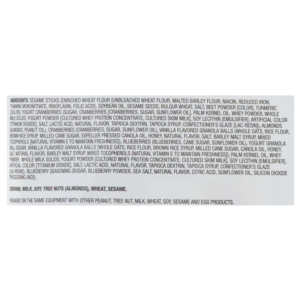 Contains: milk, soy, tree nuts (almonds), wheat, sesame. packaged on the same equipment with other peanut, tree nut, milk, wheat, soy, sesame and egg products.