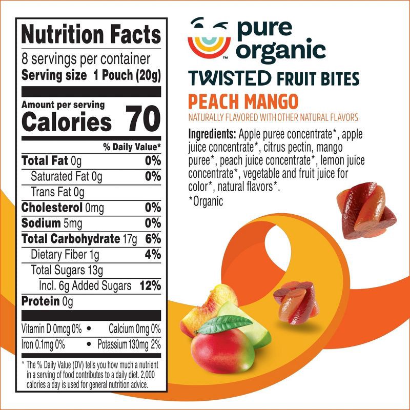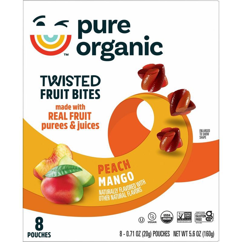 - Twisted fruit bites are way too good to be this good; Open a pouch of Pure Organic Peach Mango fruit snacks for a combo of flavors in one tasty treat