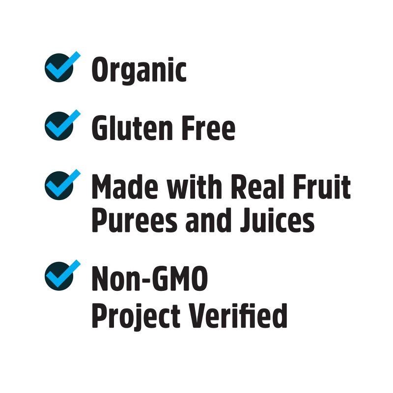 - Certified USDA Organic; Non GMO Project Verified; Gluten Free; Vegan; Real fruit purees; Real fruit juices; No artificial flavors; No high fructose corn syrup; Kosher Pareve