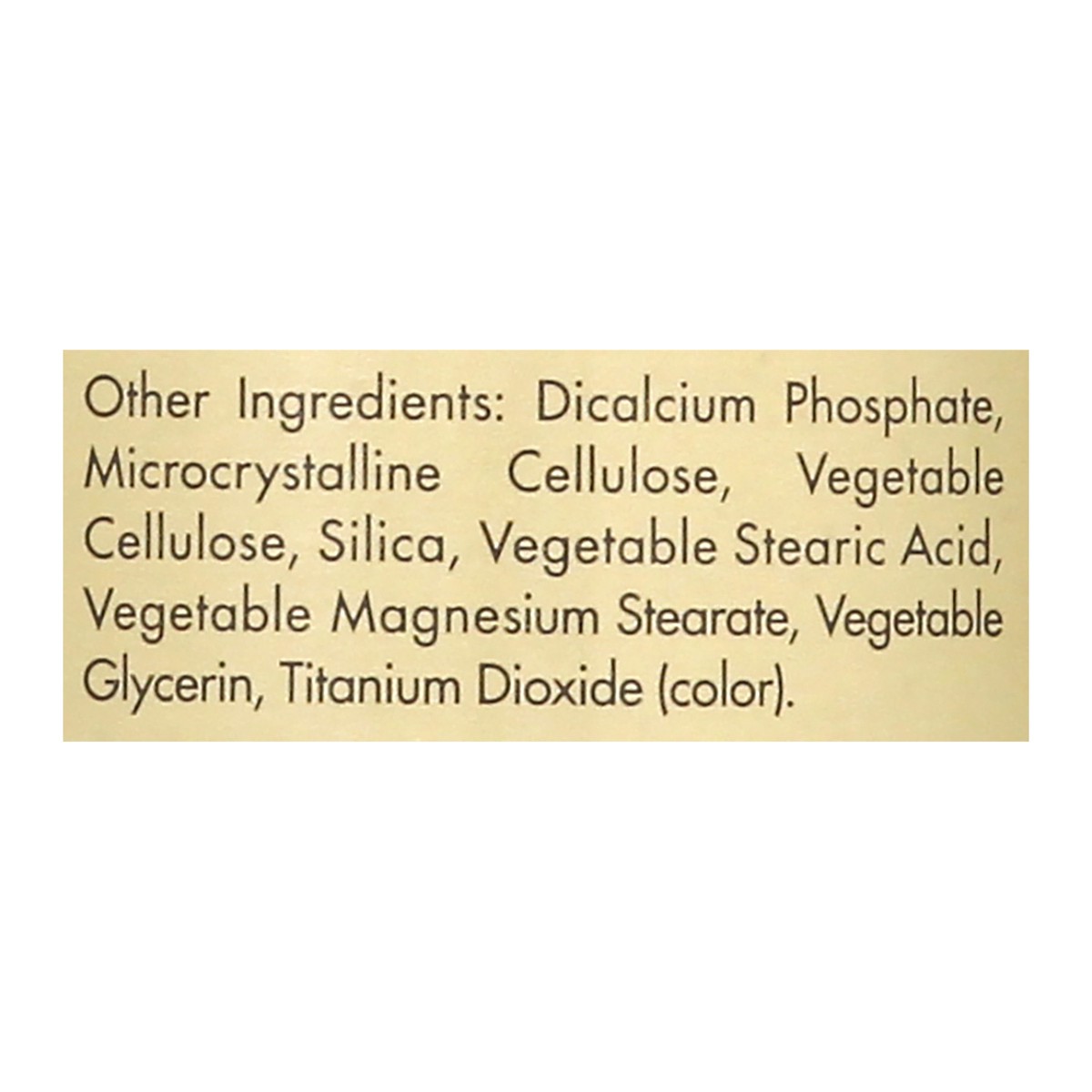Other Ingredients: Dicalcium Phosphate, Microcrystalline Cellulose, Vegetable Cellulose, Silica, Vegetable Stearic Acid, Vegetable Magnesium Stearate, Vegetable Glycerin, Titanium Dioxide (Color).