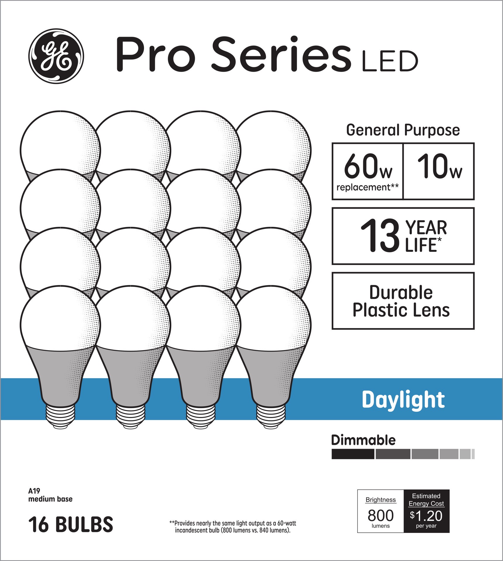 GE Pro Series 60 -Watt EQ A19 Daylight Medium screw base E26 Dimmable LED General purpose Light Bulb 16 -Pack