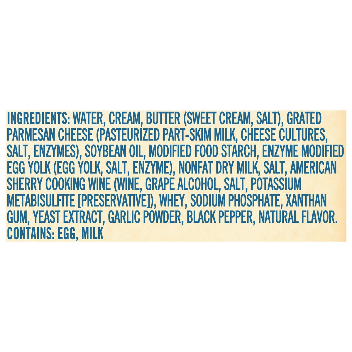 Water, Cream, Butter (Sweet Cream, Salt), Parmesan Cheese (Pasteurized Part-Skim Milk, Cheese Cultures, Salt, Enzymes), Soybean Oil, Modified Food Starch, Enzyme Modified Egg Yolk (Egg Yolk Salt, Enzy…