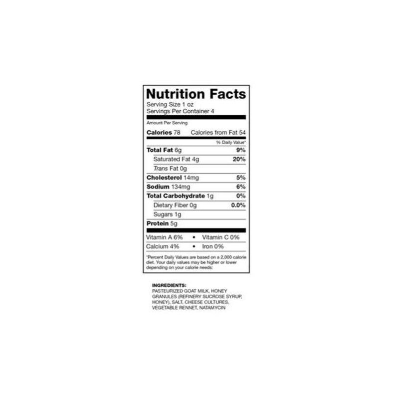 PASTEURIZED GOAT MILK, HONEY GRANULES (REFINERY SUCROSE SYRUP, HONEY), SALT, CHEESE CULTURES, VEGETAL RENNET, NATAMYCIN (NATURAL MOLD & YEAST INHIBITOR).