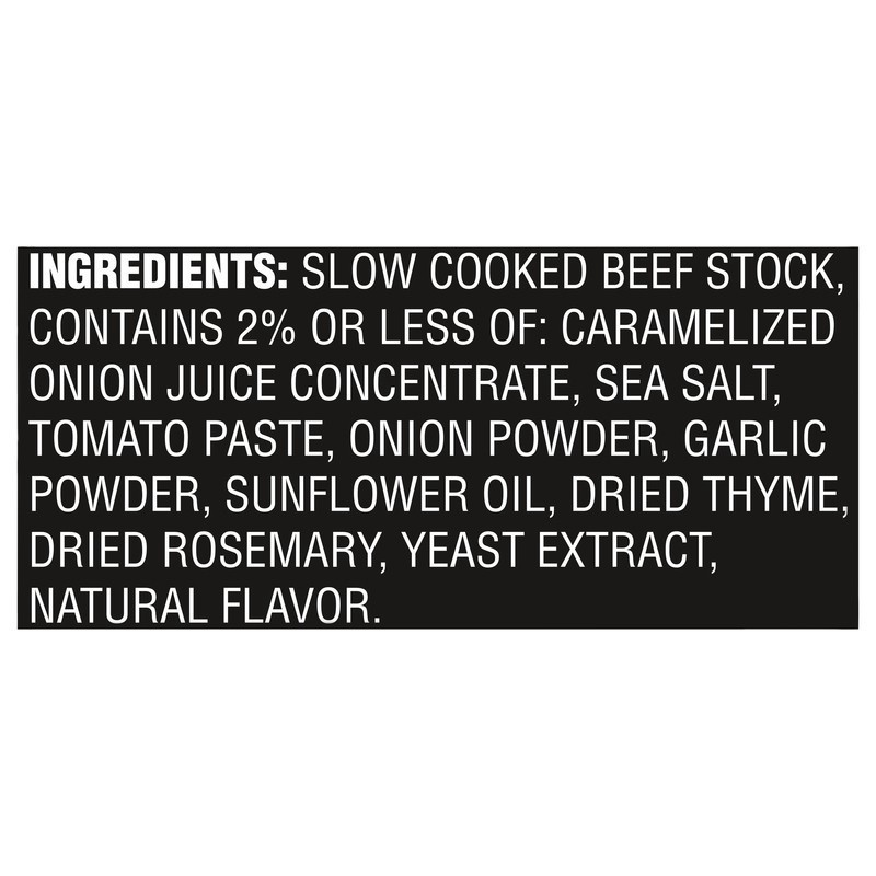 Slow Cooked Beef Stock, Contains 2% or Less of: Caramelized Onion Juice Concentrate, Sea Salt, Tomato Paste, Onion Powder, Garlic Powder, Sunflower Oil, Dried Thyme, Dried Rosemary, Yeast Extract, Nat…