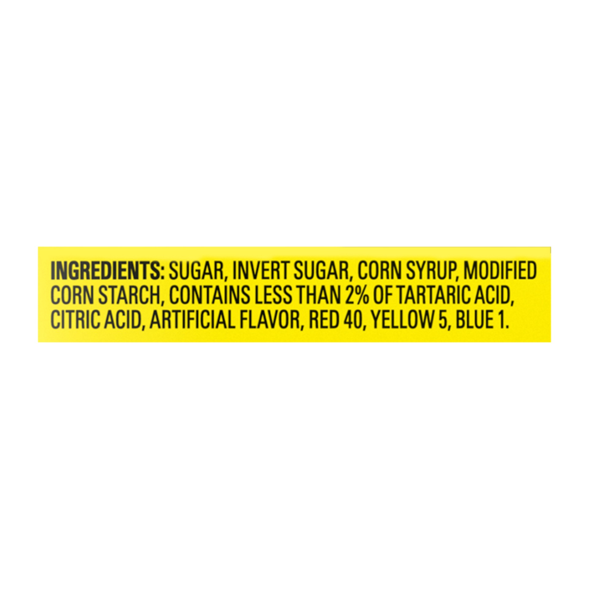 Sugar, Invert Sugar, Corn Syrup, Modified Corn Starch, Contains Less 2% of Tartaric Acid, Citric Acid, Artificial Flavor, Red 40 Yellow 5, Blue 1.