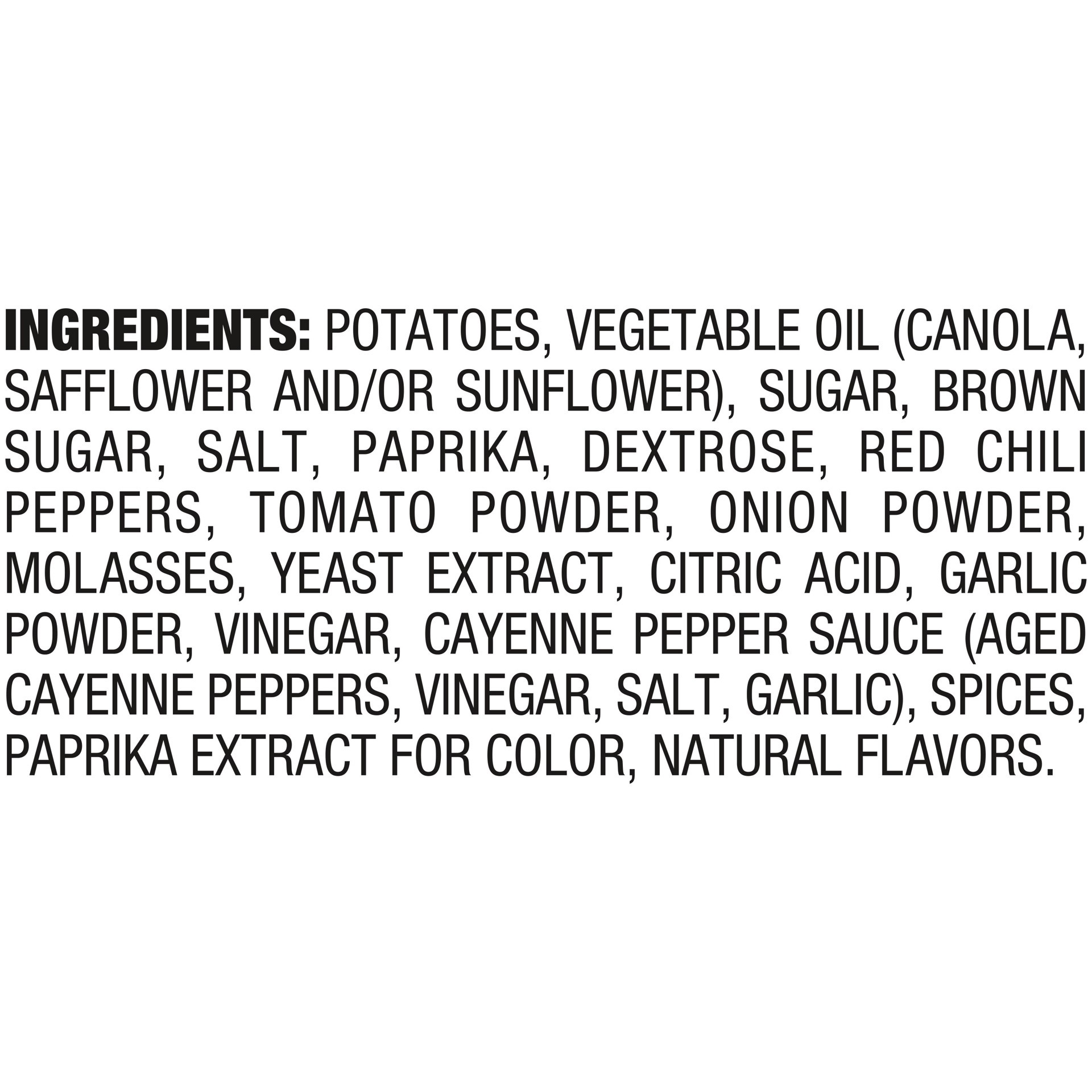 INGREDIENTS: POTATOES, VEGETABLE OIL (CANOLA, SAFFLOWER AND/OR SUNFLOWER), SUGAR, BROWN SUGAR, SALT, PAPRIKA, DEXTROSE, RED CHILI PEPPERS, TOMATO POWDER, ONION POWDER, MOLASSES, YEAST EXTRACT, CITRIC …