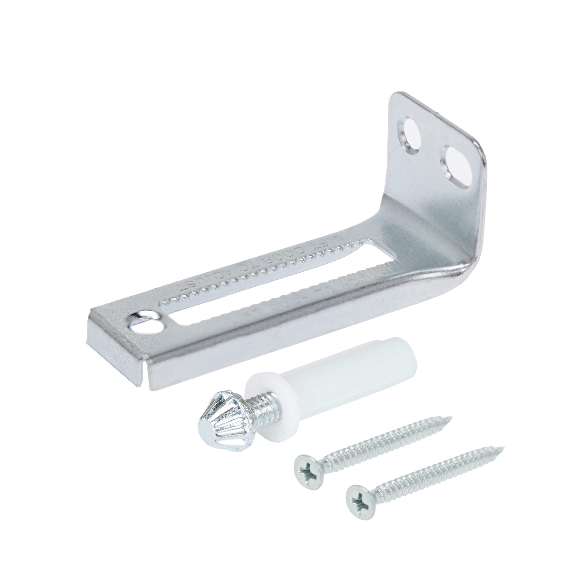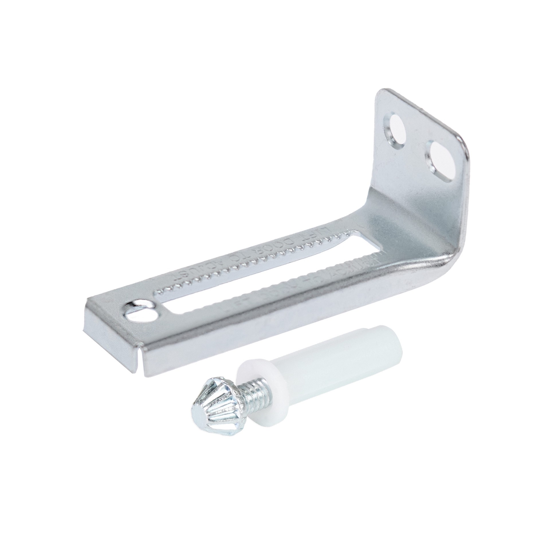 Bottom pivot pin and mount bracket for bi-fold closet door application. Steel pin with nylon sleeve for height adjustment and tapered grooved tip for horizontal adjustment with bottom pivot bracket. F…