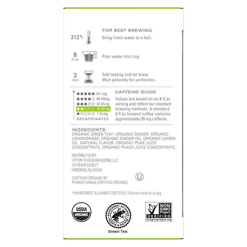 Organic Green Tea ^, Organic Ginger, Organic Lemongrass, Organic Ginger Oil, Organic Lemon Oil, Natural Flavor, Organic Pear Juice Concentrate, Organic Peach Juice Concentrate, ^ Rainforest Alliance C…
