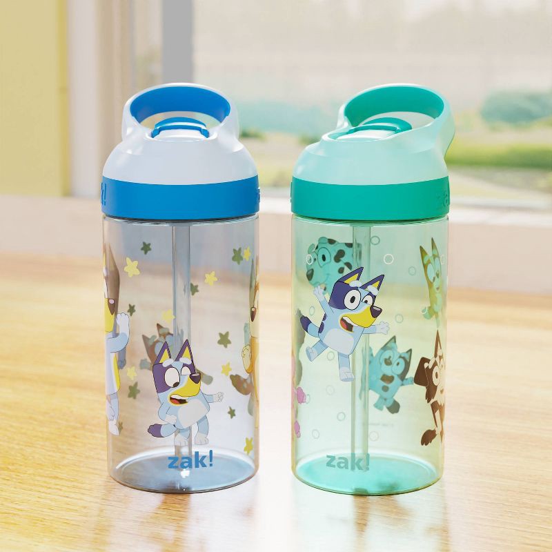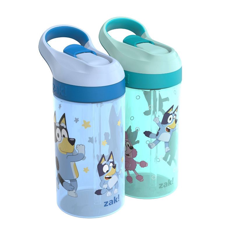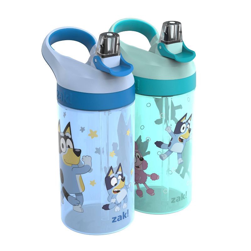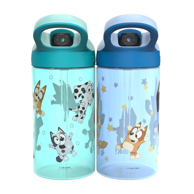 Each water bottle in this Bluey drinkware set holds 16 ounces. A cover keeps the spout clean when it's not being used, and it doesn't leak when it's fully closed. These bottles can be tossed into a ba…