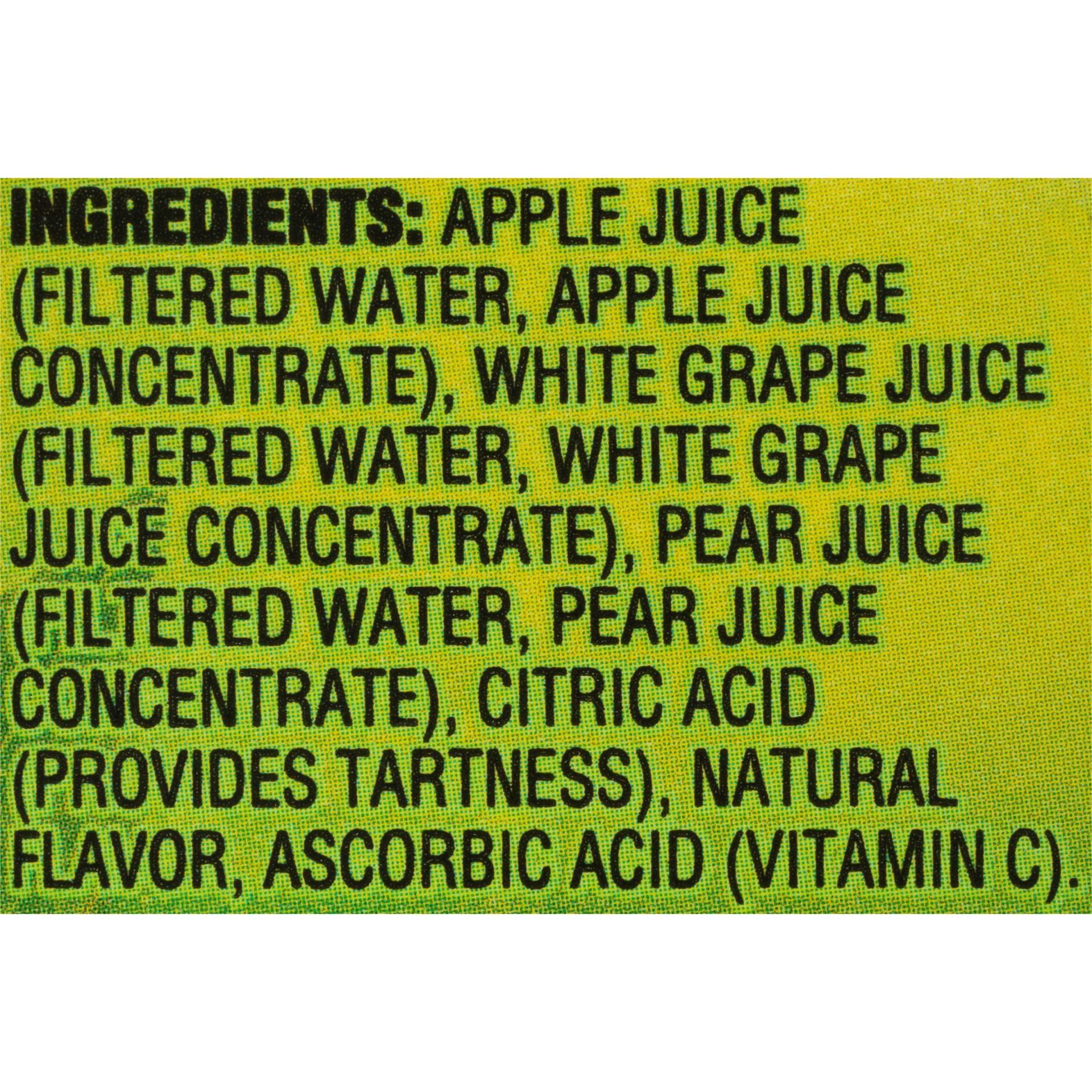Apple Juice Filtered Water, Apple Juice Concentrate), White Grape Juice (Filtered Water, White Grape Juice Concentrate), Pear Juice (Filtered Water, per Juice Concentrate), Citric Acid (Provides Tartn…