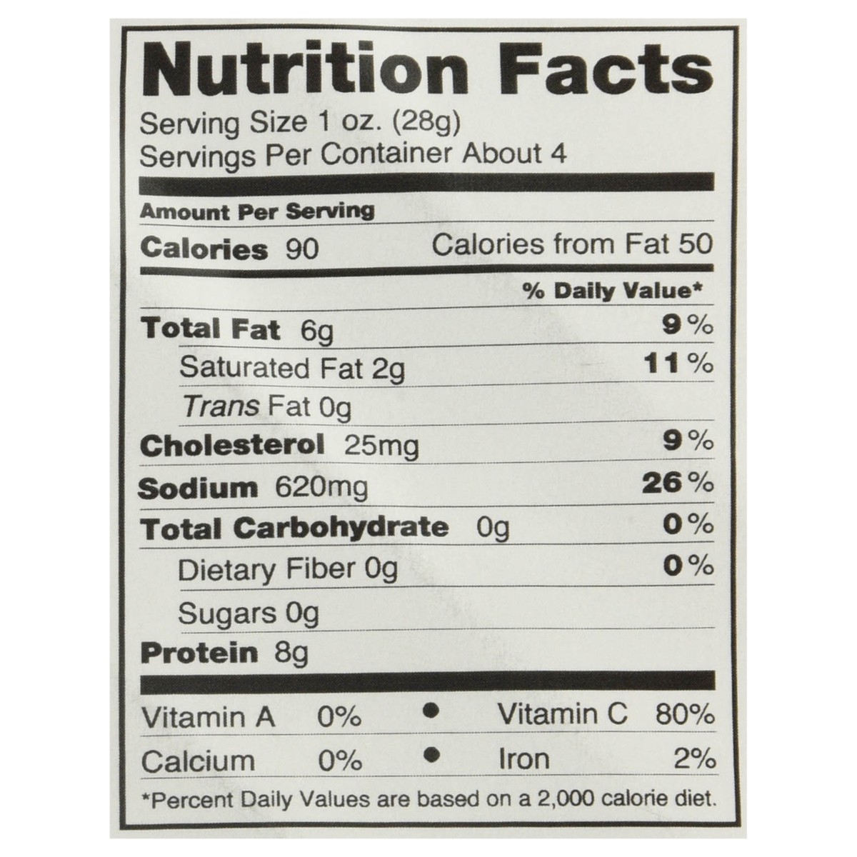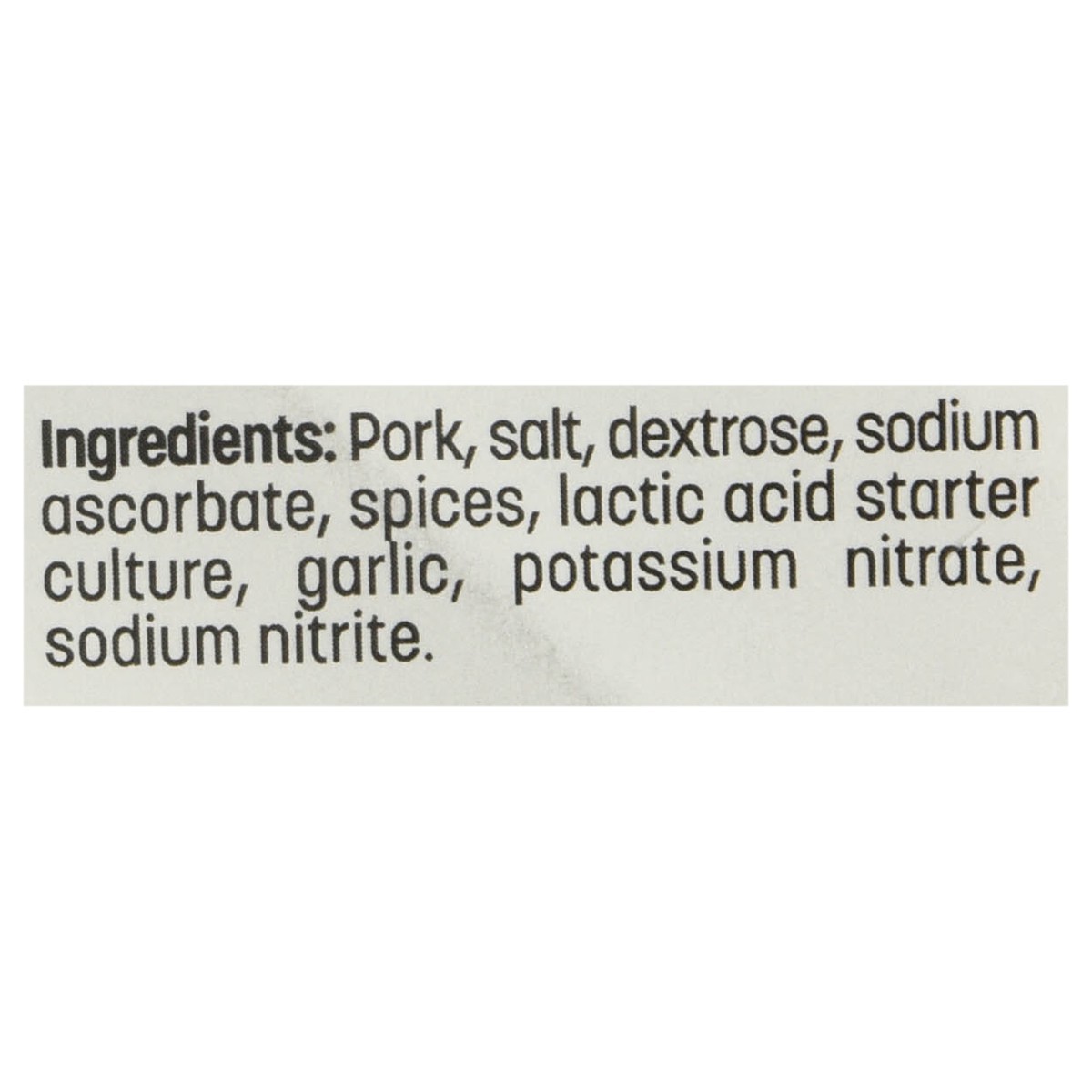 Pork, Salt, Dextrose, Sodium Ascorbate, Spices, Lactic Acid Starter Culture, Garlic, Potassium Nitrate, Sodium Nitrite.
