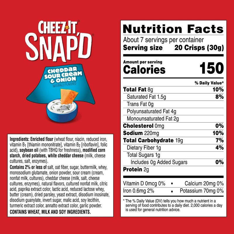 Big cheese taste baked to crispy perfection. Cheez-It Snap'd Cheddar Sour Cream and Onion cheesy baked chips are super thin and loaded with tons of cheese flavor. Made with 100% real cheese inside and…