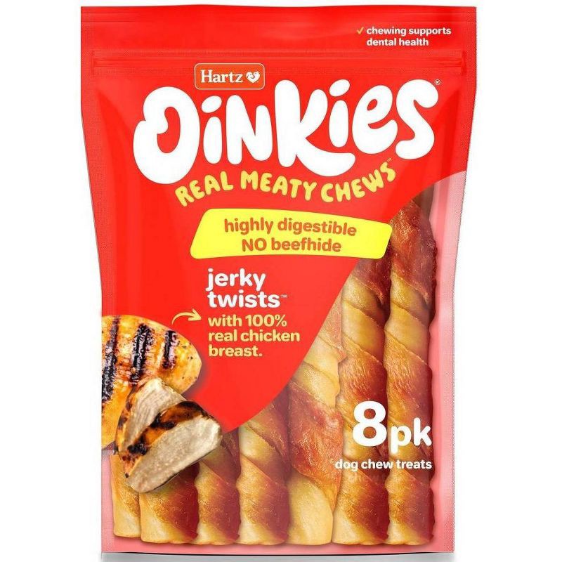 Oinkies Jerky Twists are highly digestible and irresistible dog treats made with layers of naturally good, real ingredients you can see. Without any beef rawhide, these Oinkies dog treats are made wit…