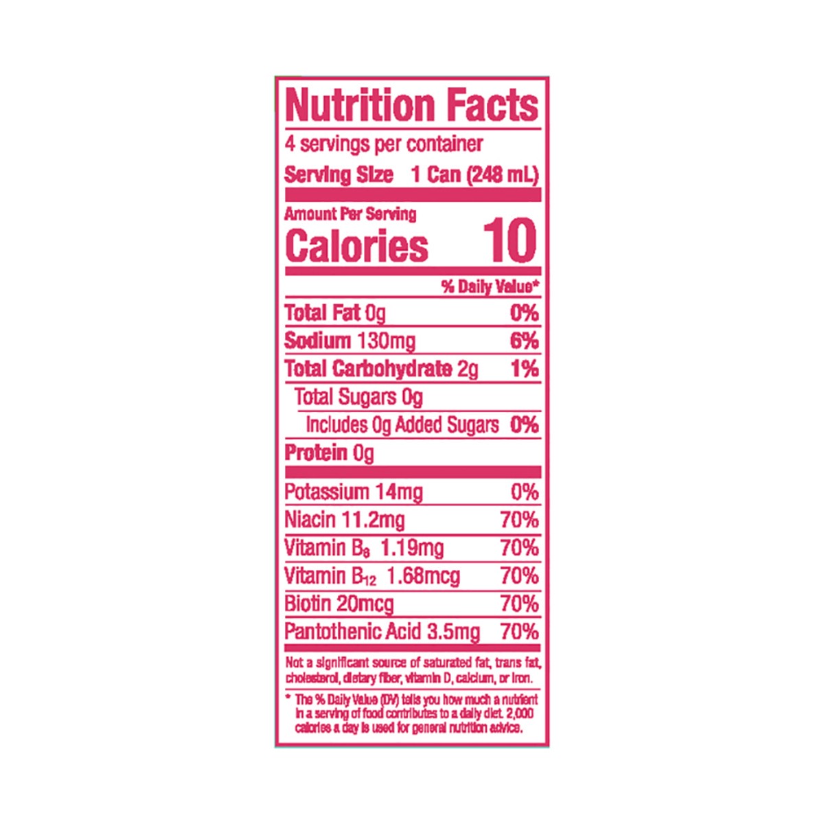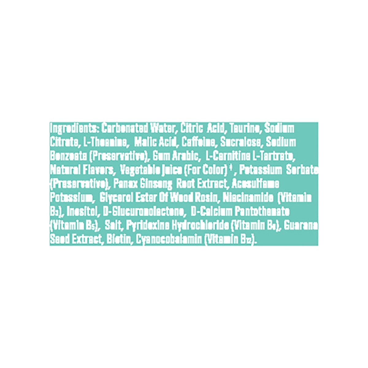 Carbonated Water, Citric Acid, Taurine, Sodium Citrate, L-Theanine, Malic Acid, Caffeine, Sucralose, Sodium Benzoate (Preservative), Gum Arabic, L-Carnitine L-Tartrate, Natural Flavors, Vegetable Juic…