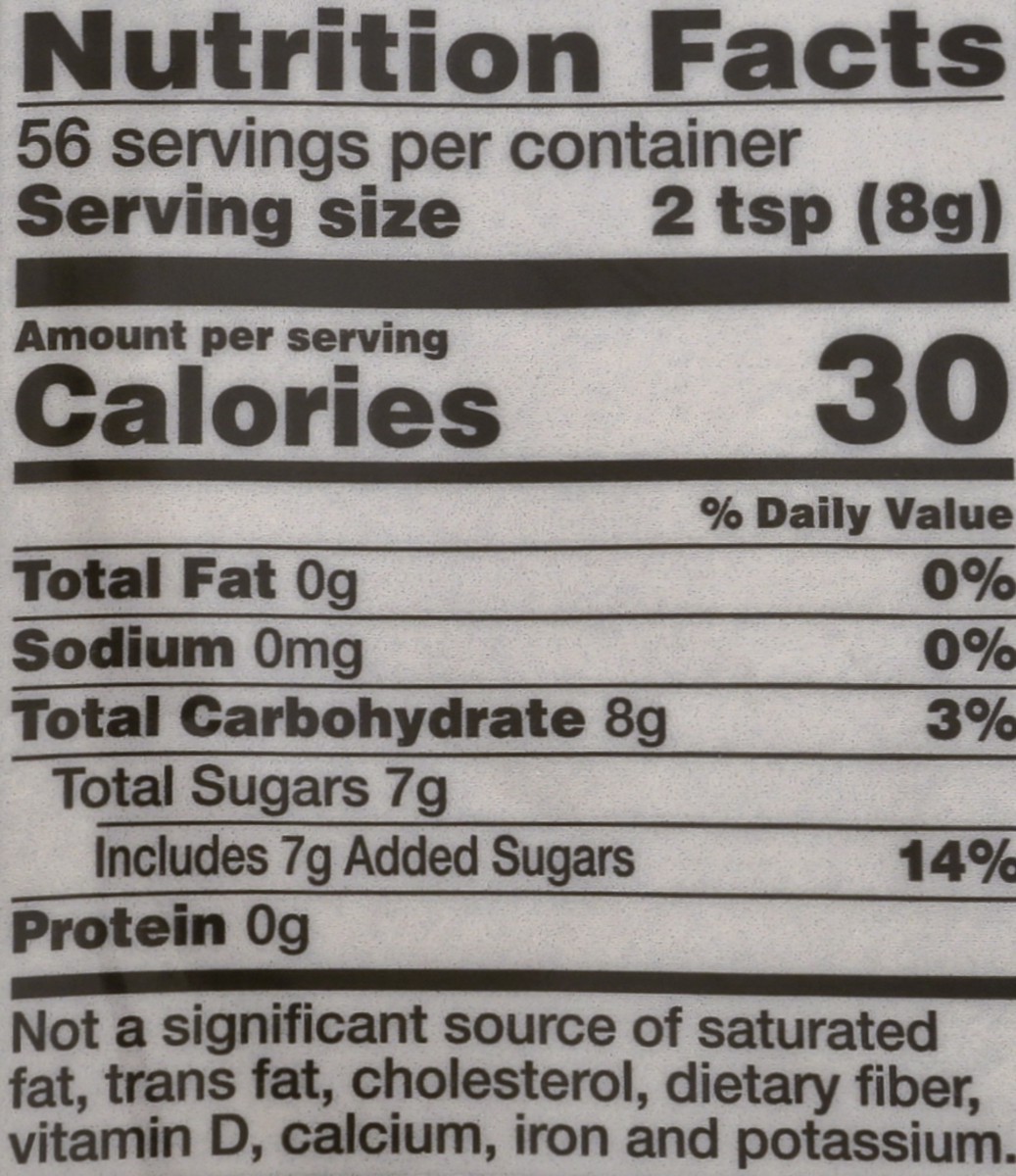 Per 2 Tsp: 30 calories; 0 g sat fat (0% DV); 10 mg sodium (0% DV); 7 g total sugars. USDA Organic. Certified Organic by Quality Assurance International. Organic from the Source: Doesn't t feel good to…