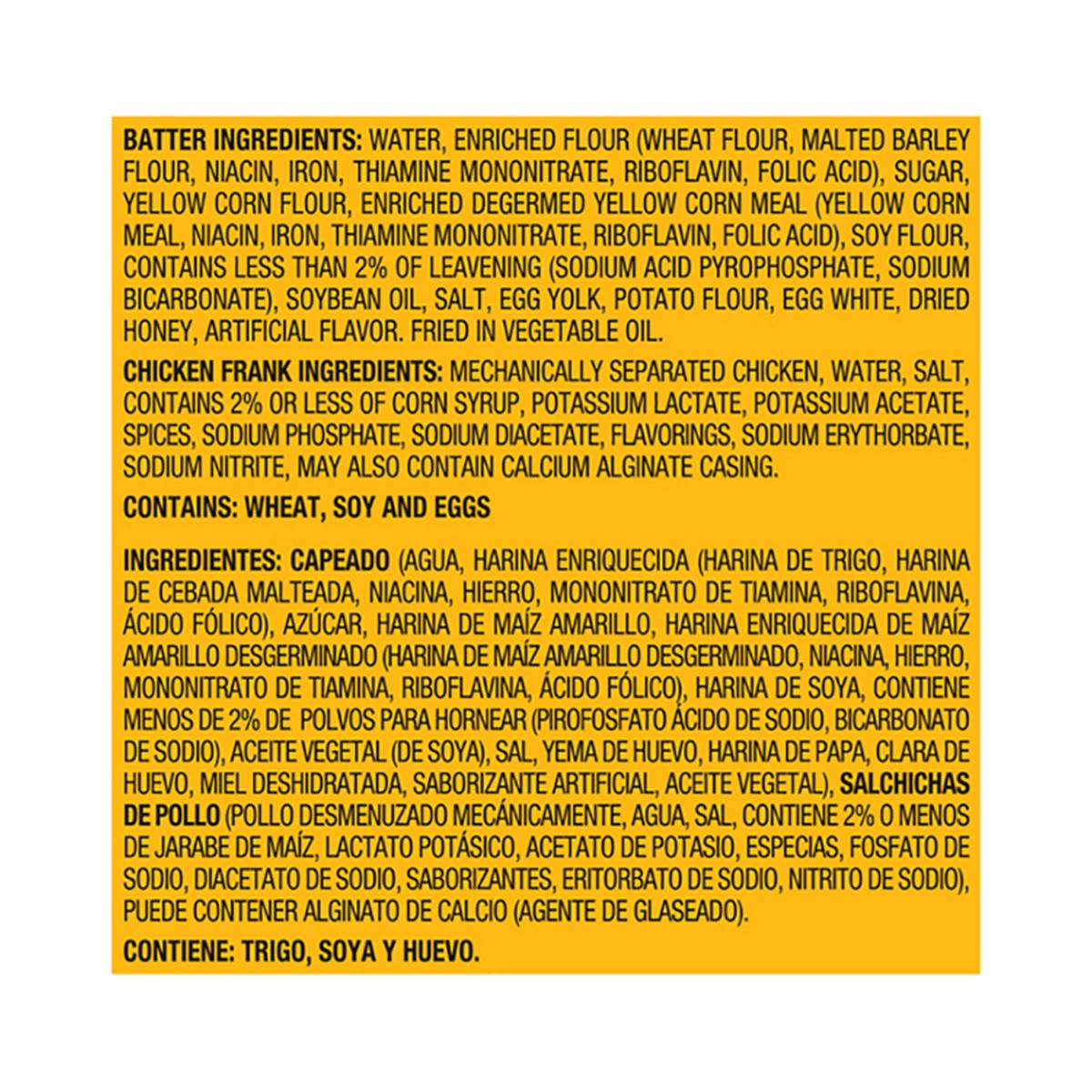 Batter Ingredients: Water, Enriched Flour (Wheat Flour, Malted Barley Flour, Niacin, Iron, Thiamine Mononitrate, Riboflavin, Folic Acid), Sugar, Yellow Corn Flour, Enriched Degermed Yellow Corn Meal (…
