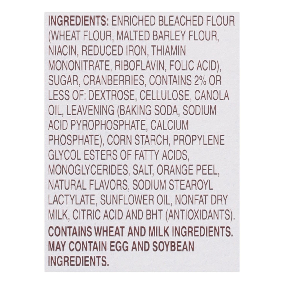 Enriched Bleached Flour (Wheat Flour, Malted Barley Flour, Niacin, Reduced Iron, Thiamin Mononitrate, Riboflavin, Folic Acid), Sugar, Cranberries, Contains 2% or Less of: Dextrose, Cellulose, Canola O…