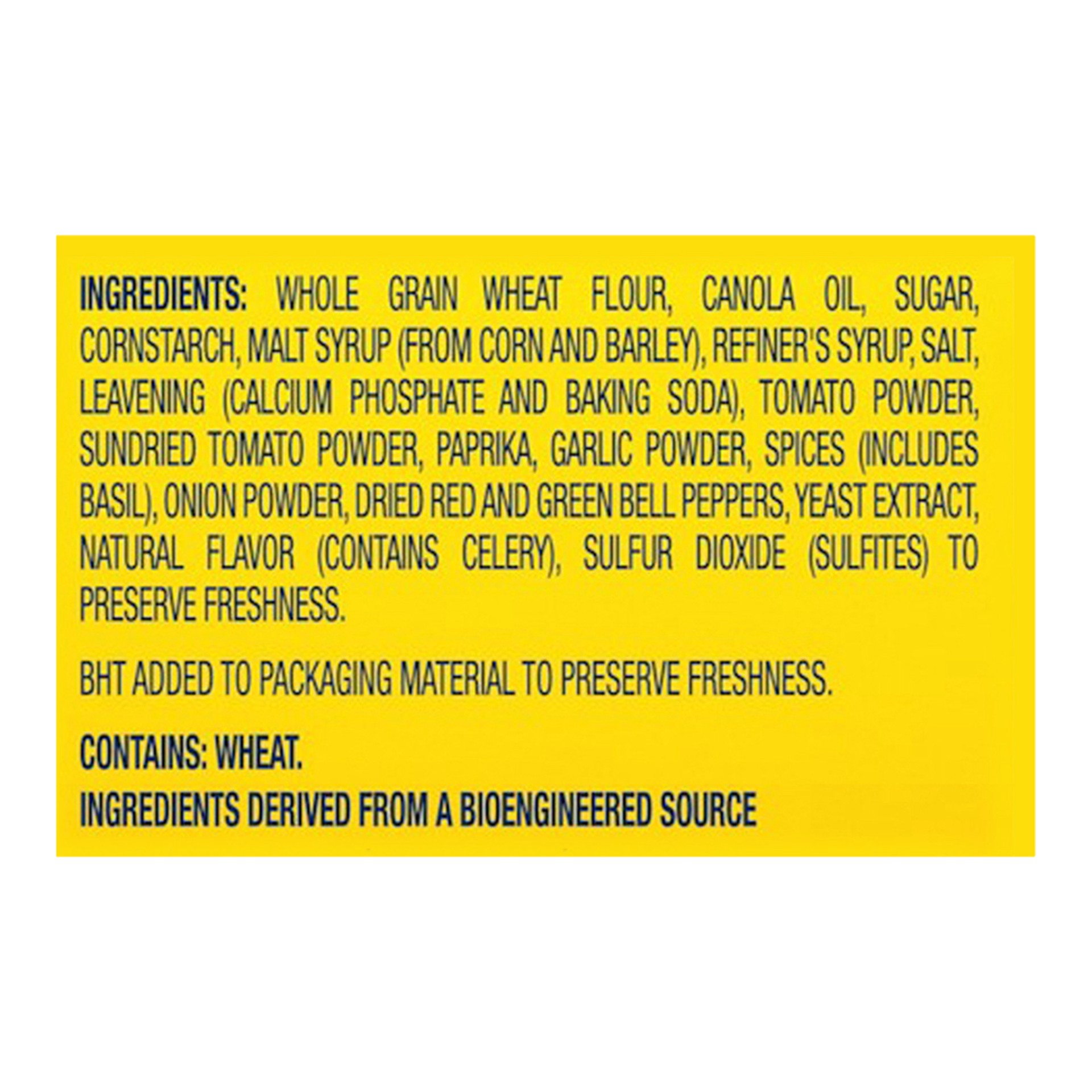 INGREDIENTS: WHOLE GRAIN WHEAT FLOUR, CANOLA OIL, SUGAR, CORNSTARCH, MALT SYRUP (FROM CORN AND BARLEY), REFINER''S SYRUP, SALT, LEAVENING (CALCIUM PHOSPHATE, BAKING SODA), TOMATO POWDER, SUNDRIED TOMA…