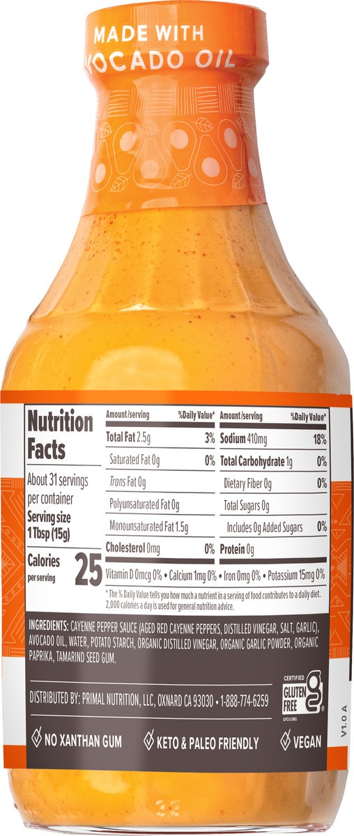 Cayenne Pepper Sauce (Aged Red Cayenne Peppers, Distilled Vinegar, Salt, Garlic), Avocado Oil, Water, Potato Starch, Organic Distilled Vinegar, Organic Garlic Powder, Organic Paprika, Tamarind Seed Gu…
