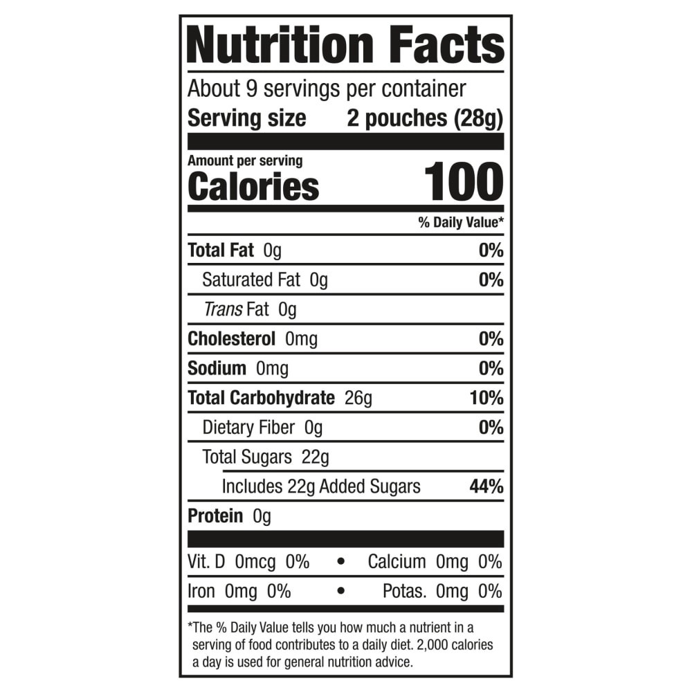 Sugar, Corn Syrup, Corn Starch, Modified Food Starch, Contains 2% or Less of Natural and Artificial Flavors, Shellac, Carnauba Wax, Coconut Oil, White Mineral Oil, Vegetable Juice (Color), Red 40, Yel…