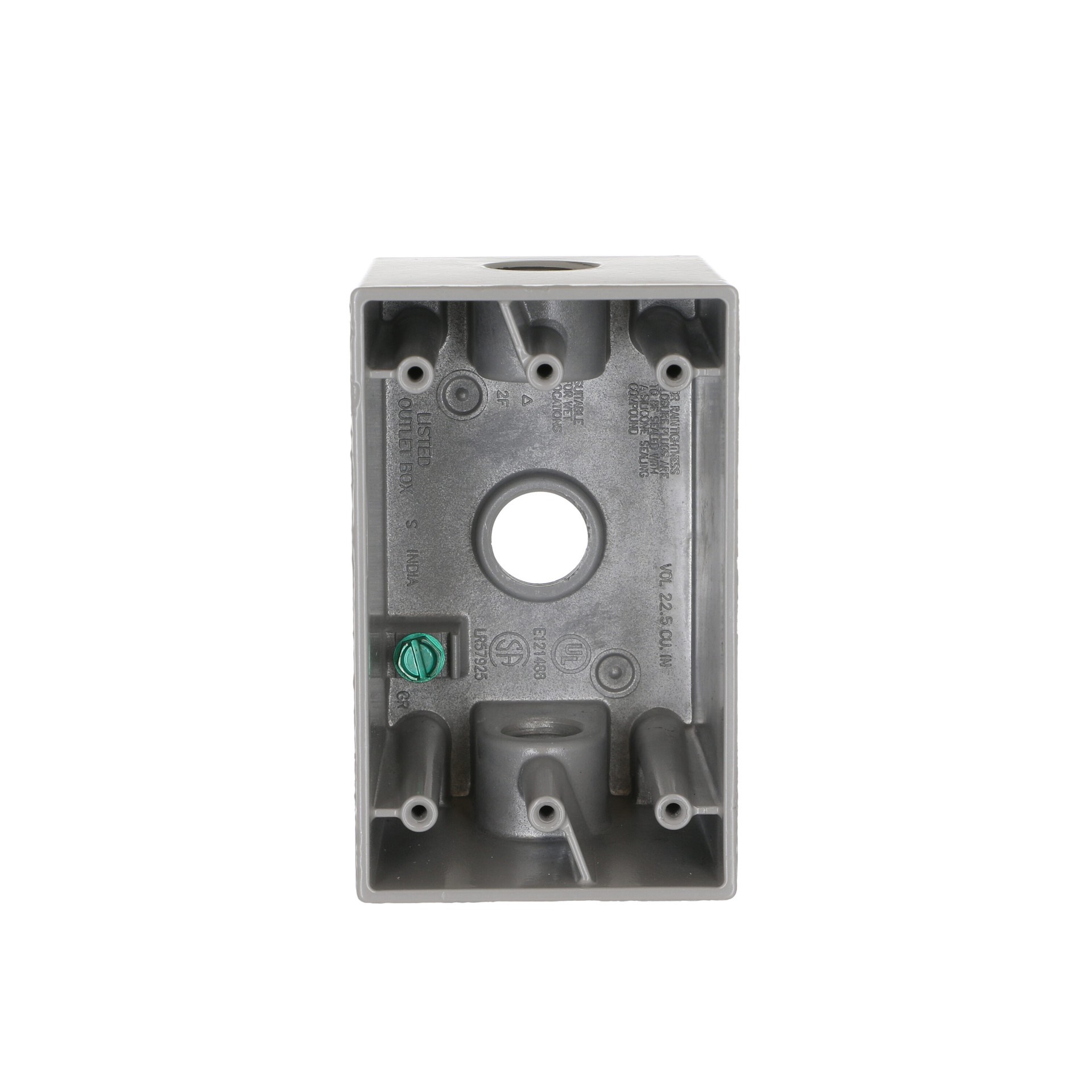 Die-cast aluminum construction. Durable powder coat finish. Includes mounting lugs. 22.5 cu in capacity. Three 1/2 in threaded outlets. NEMA 3R rated. cULus Listed.