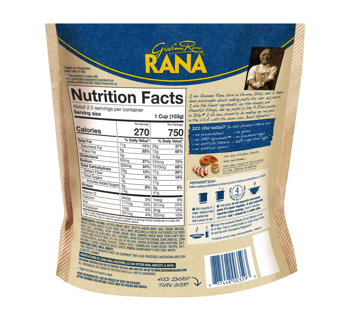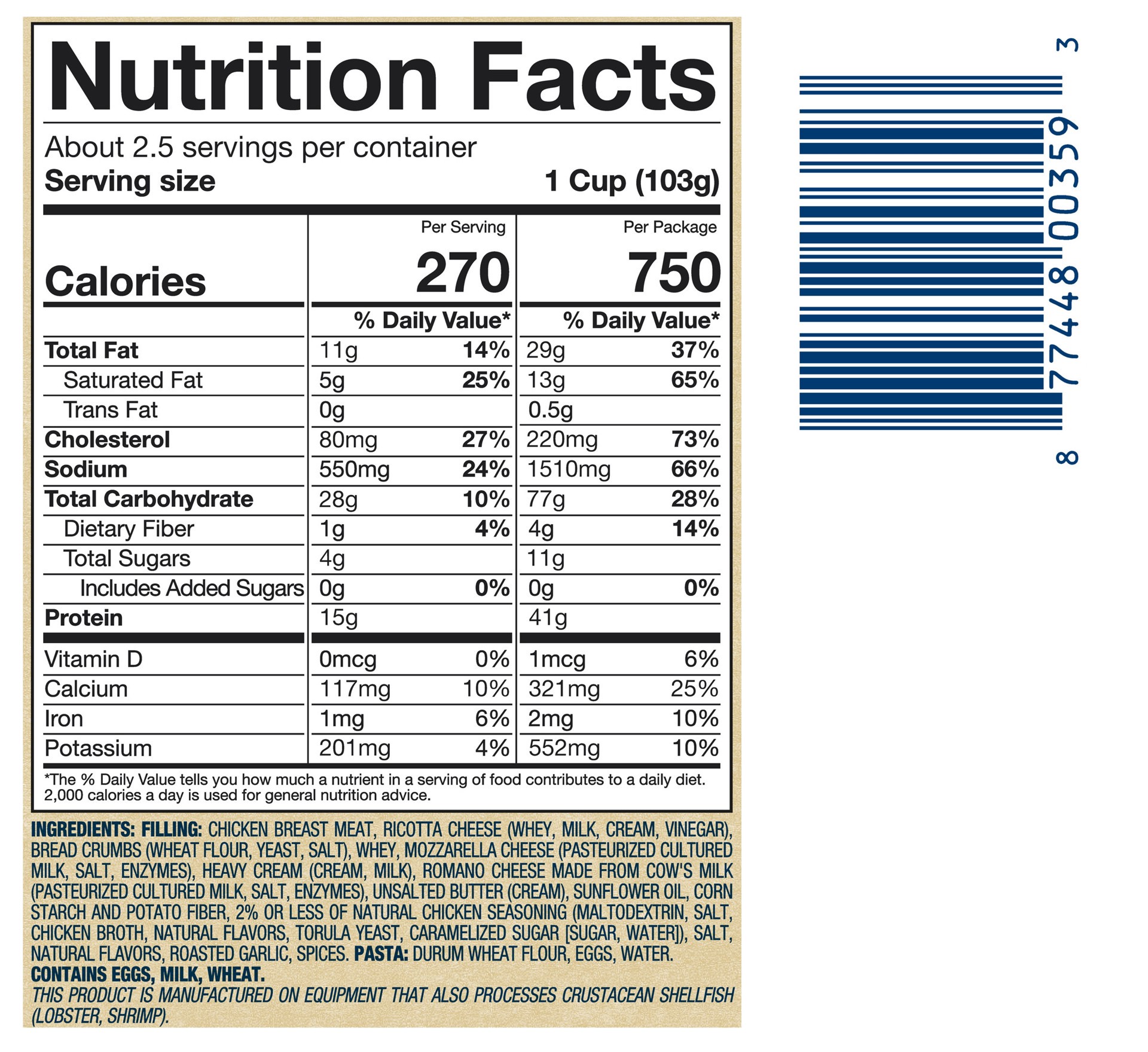 Filling: Chicken Breast Meat, Ricotta Cheese (Whey, Milk, Cream, Vinegar), Bread Crumbs (Wheat Flour, Yeast, Salt), Whey, Mozzarella Cheese (Pasteurized Cultured Milk, Salt, Enzymes), Heavy Cream (Cre…