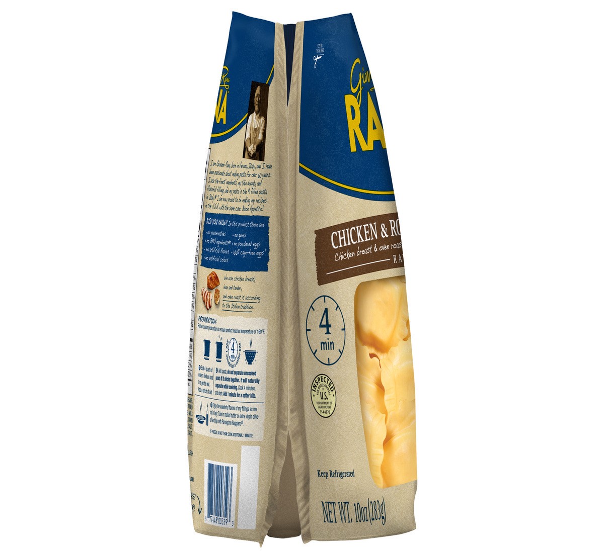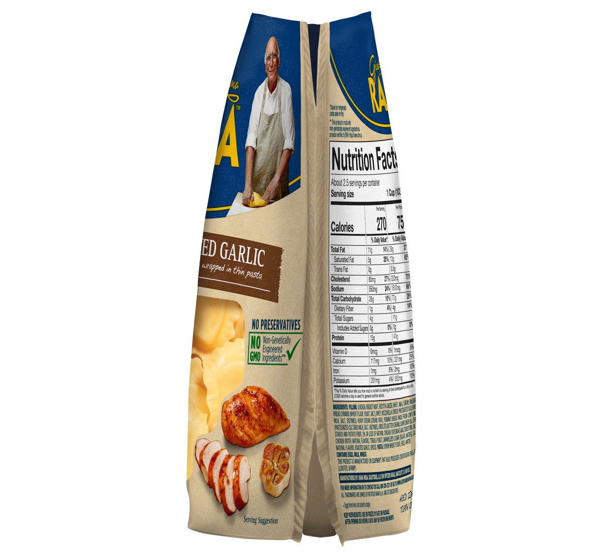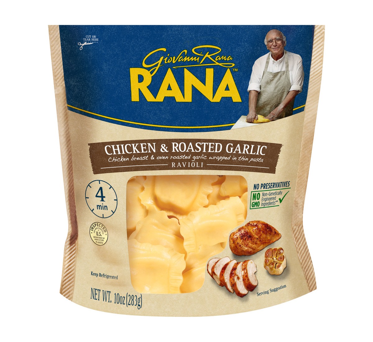 Giovanni Rana's Chicken & Roasted Garlic Ravioli is made with chicken breast and oven roasted garlic wrapped in thin pasta. Using high quality ingredients and no preservatives, no powdered eggs, no gu…