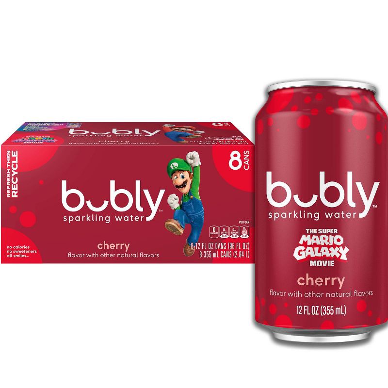 - Bubly Sparkling Water Cherry: Cherry flavor with other great tasting, natural flavors featuring your favorite characters from The Super Mario Galaxy Movie, only in theaters.