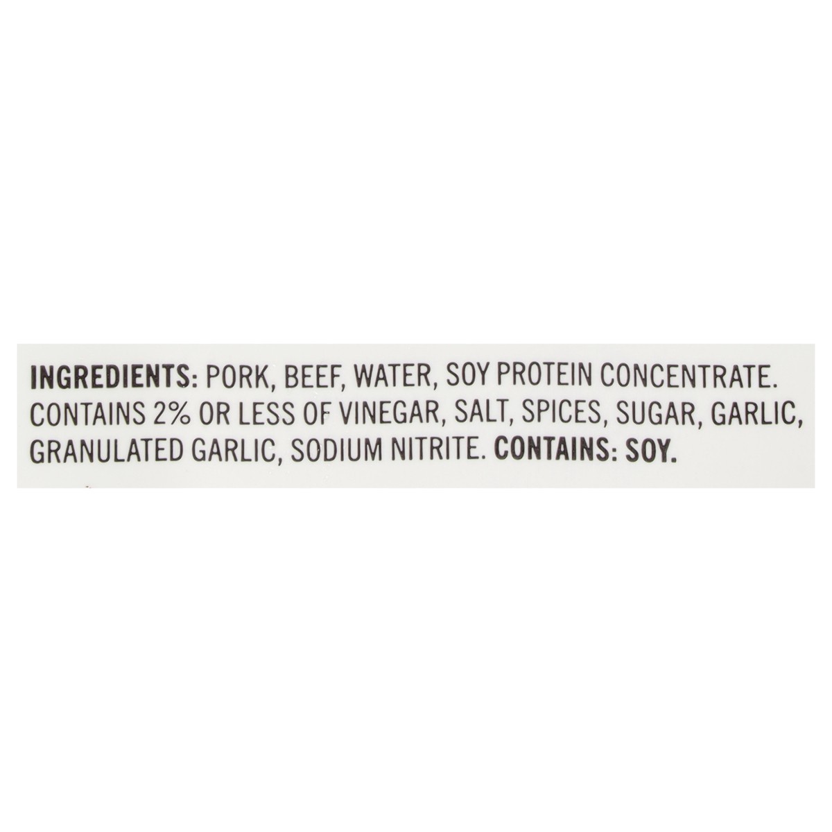 Pork, Beef, Water, Soy Protein Concentrate, Contains 2% or Less of Vinegar, Salt, Spices, Sugar, Garlic, Granulated Garlic, Sodium Nitrite.