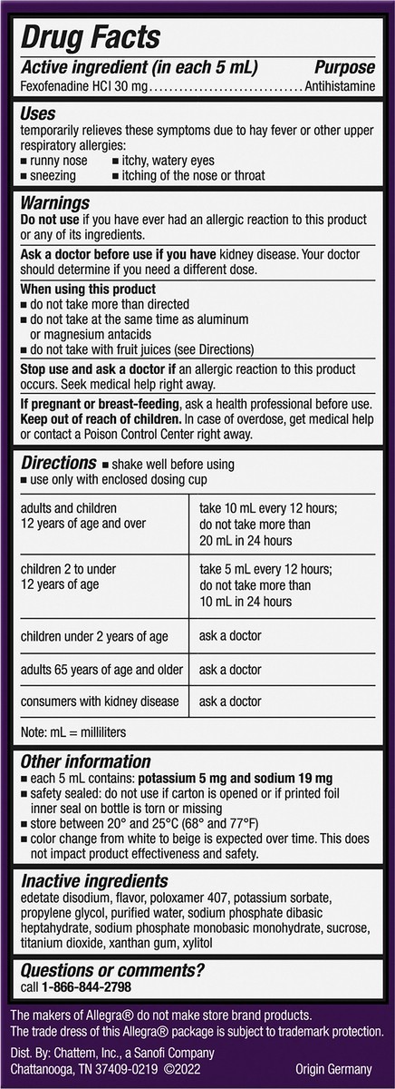 In Each 5 mL: Active Ingredients: Fexofenadine HCI (30 mg), Antihistamine. Inactive Ingredients: Edetate Disodium, Flavor, Poloxamer 407, Potassium Sorbate, Propylene Glycol, Purified Water, Sodium Ph…
