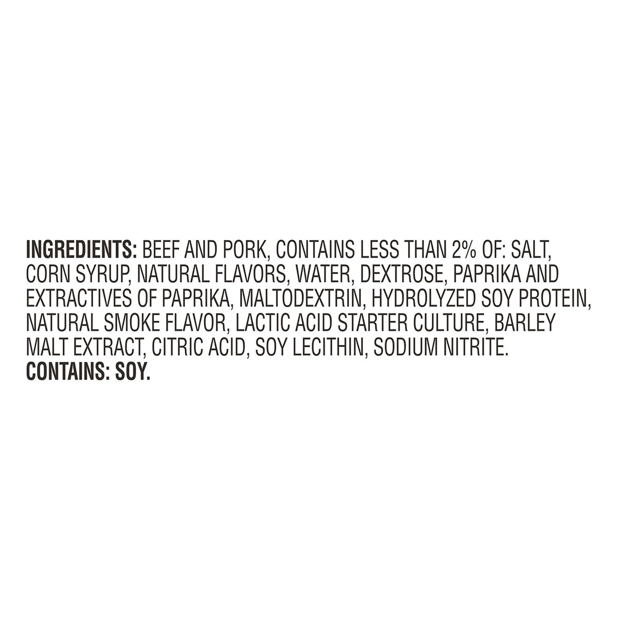 Beef and Pork, Contains Less than 2% of: Salt, Corn Syrup, Natural Flavors, Water, Dextrose, Paprika and Extractives of Paprika, Maltodextrin, Hydrolyzed Soy Protein, Natural Smoke Flavor, Lactic Acid…
