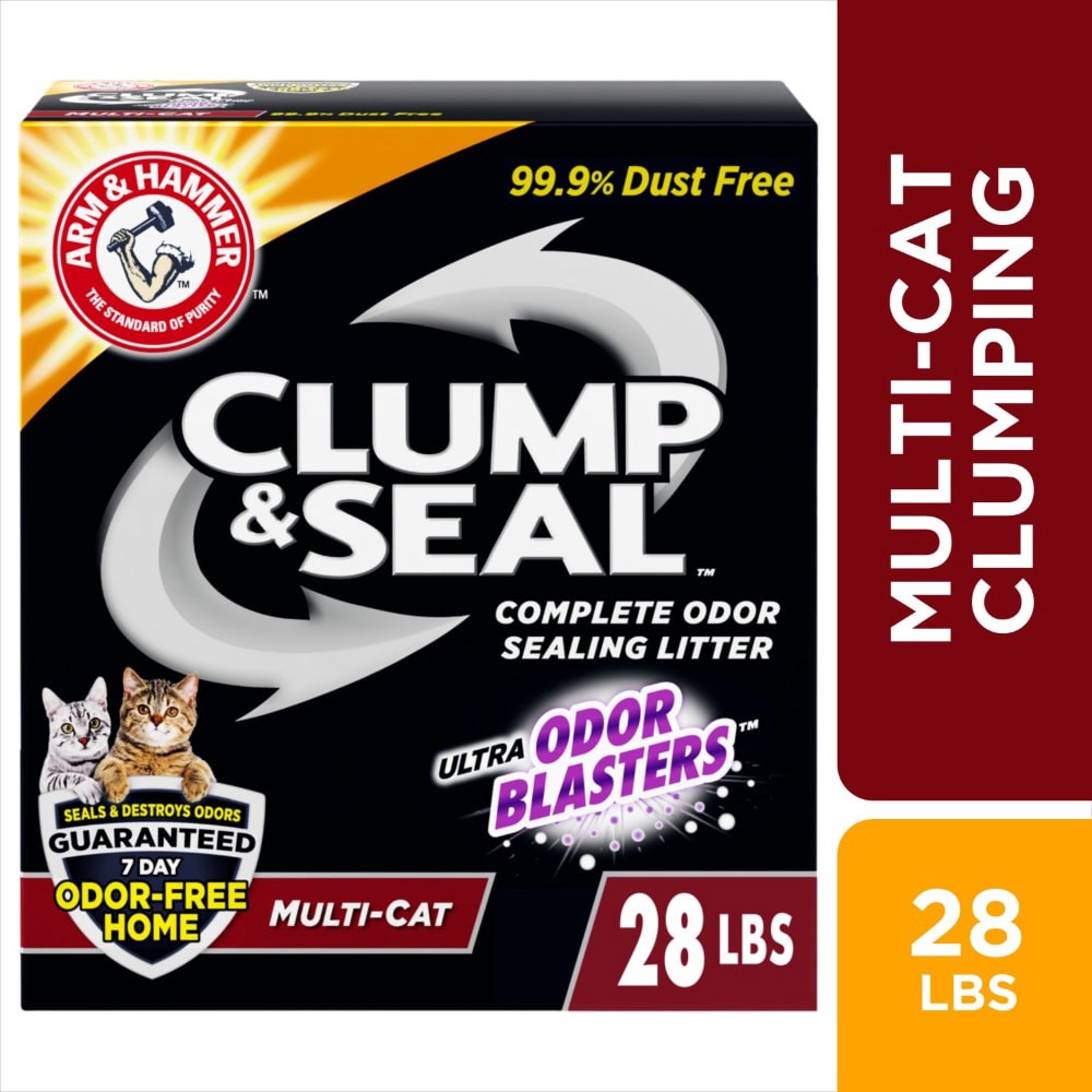 - ARM & HAMMER Clump & Seal Multi-Cat Litter (caja de 28 lb) es una arena aglomerante revolucionaria para gatos especialmente formulada para sellar y destruir los olores antes de que salgan de la caja de arena para gatos.